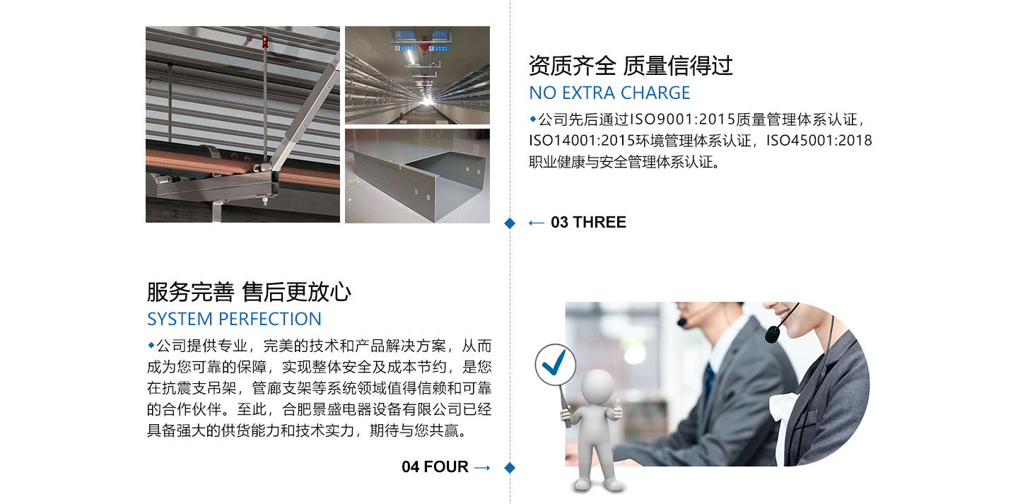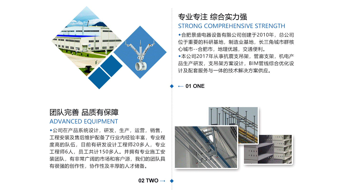 合肥景盛電器設備有限公司創(chuàng)建于2011年,注冊資本3000萬,總公司位于中國重要的科研基地,制造業(yè)基地,長三角城市群中心城市-----合肥市,地理位置好,交通方便。本公司2017年從事抗震支吊架,電纜橋架,機電產(chǎn)品生產(chǎn)研發(fā),支吊架方案設計,BIM管線綜合優(yōu)化設計及配套服務與一體的技術解決方案供應。公司在產(chǎn)品系統(tǒng)設計,研發(fā),生產(chǎn),運營,銷售,工程安裝及售后維護配備了行業(yè)內(nèi)經(jīng)驗豐富,服務程度高的隊伍,目前有研發(fā)設計工程師20多人,工程師6人,員工共計150多人。并擁有施工安裝團隊,有非常廣闊的市場和客戶源,我們的團隊具有很強的創(chuàng)作性,協(xié)作性及豐厚的人才儲備。 公司先后通過ISO9001:2015質量管理體系認證...